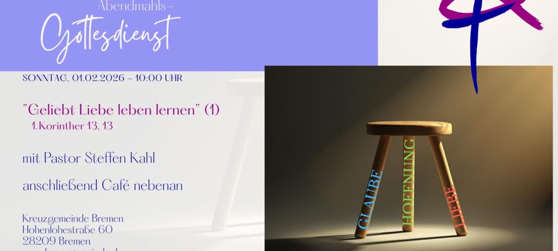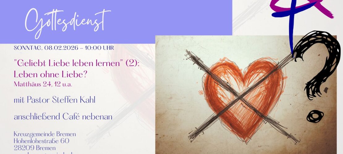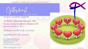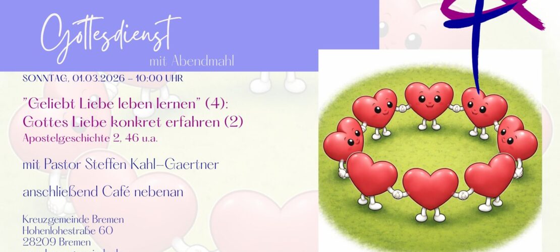 Sonntag, 22. Februar 2026, 10 Uhr: Geliebt Liebe leben lernen (3): Gottes Liebe konkret erfahren Predigt: Pastor Steffen Kahl-Gaertner anschließend Café nebenan Kreuzgemeinde Bremen