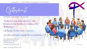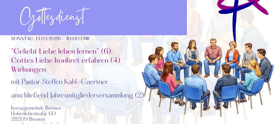 6515. März 2026, 10 Uhr – Gottesdienst Geliebt Liebe leben lernen (6):Gottes Liebe konkret erfahren (4) – WirkungenPredigt: Pastor Steffen Kahl-Gaertner anschl. Jahresmitgliederversammlung (2) anschließend