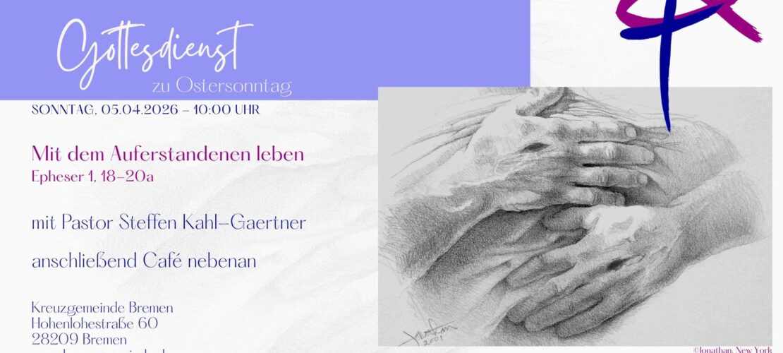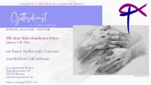 Oster-Gottesdienst 05. April 26 – 10 Uhr Mit dem Auferstandenen leben Epheser 1, 18-20a mit Pastor Steffen Kahl-Gaertner anschließend Café nebenan Kreuzgemeinde Bremen