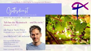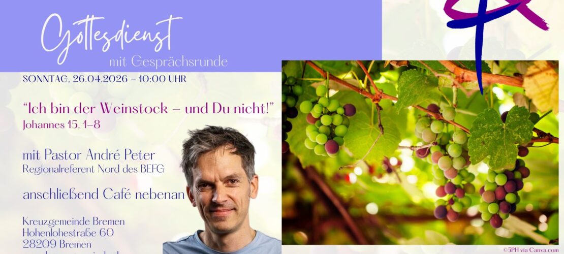 26. April 2026, 10 Uhr Gottesdienst Predigt inkl. Gesprächsrunde: “Ich bin der Weinstock – und Du nicht!” Johannes 15, 1-8 Predigt: Pastor André Peter Regionalreferent
