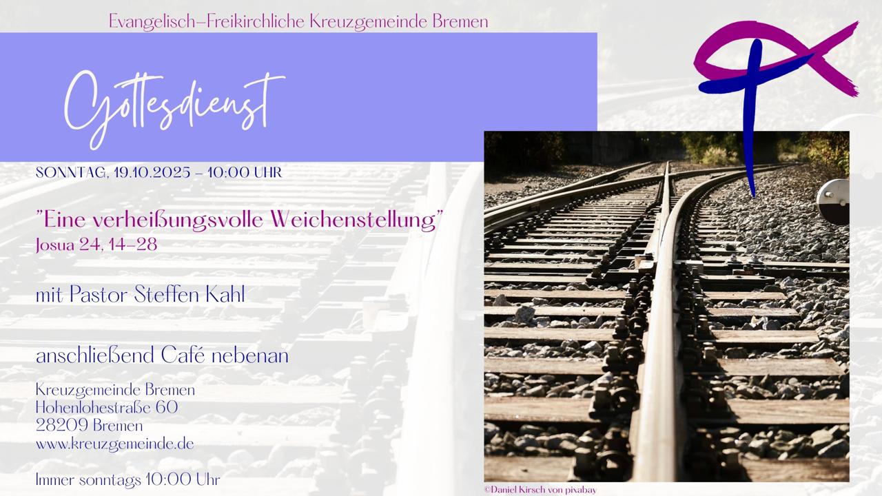 Sonntag, 19. Oktober 2025 – 10 Uhr “Eine verheißungsvolle Weichenstellung“ Josua 24, 14-28 mit Pastor Steffen Kahl anschließend Café nebenan Kreuzgemeinde Bremen Hohenlohestr. 60 28209 Bremen www.kreuzgemeinde.de https://www.youtube.com/watch?v=Ru4CGSU-eJM