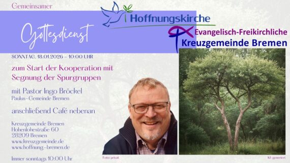 Gemeinsamer Gottesdienst Hoffnungskirche & Kreuzgemeinde Bremen zum Start der Kooperation mit Segnung der Spurgruppen Predigt: Pastor Ingo Bröckel Paulus-Gemeinde Bremen ehemal langjähriger Vorsitzender der Ev. Allianz Bremen anschließend Café nebenan Kreuzgemeinde Bremen Hohenlohestr. 60 28209 Bremen www.kreuzgemeinde.de Immer sonntags 10:00 Uhr https://www.youtube.com/watch?v=W6FjI8bDe-U