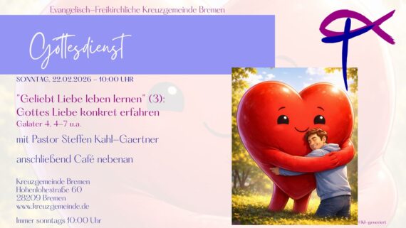 Sonntag, 22. Februar 2026, 10 Uhr: Geliebt Liebe leben lernen (3): Gottes Liebe konkret erfahren Predigt: Pastor Steffen Kahl-Gaertner anschließend Café nebenan Kreuzgemeinde Bremen Hohenlohestr. 60 28209 Bremen www.kreuzgemeinde.de Immer sonntags 10:00 Uhr https://www.youtube.com/watch?v=JfPHSOCX7-I