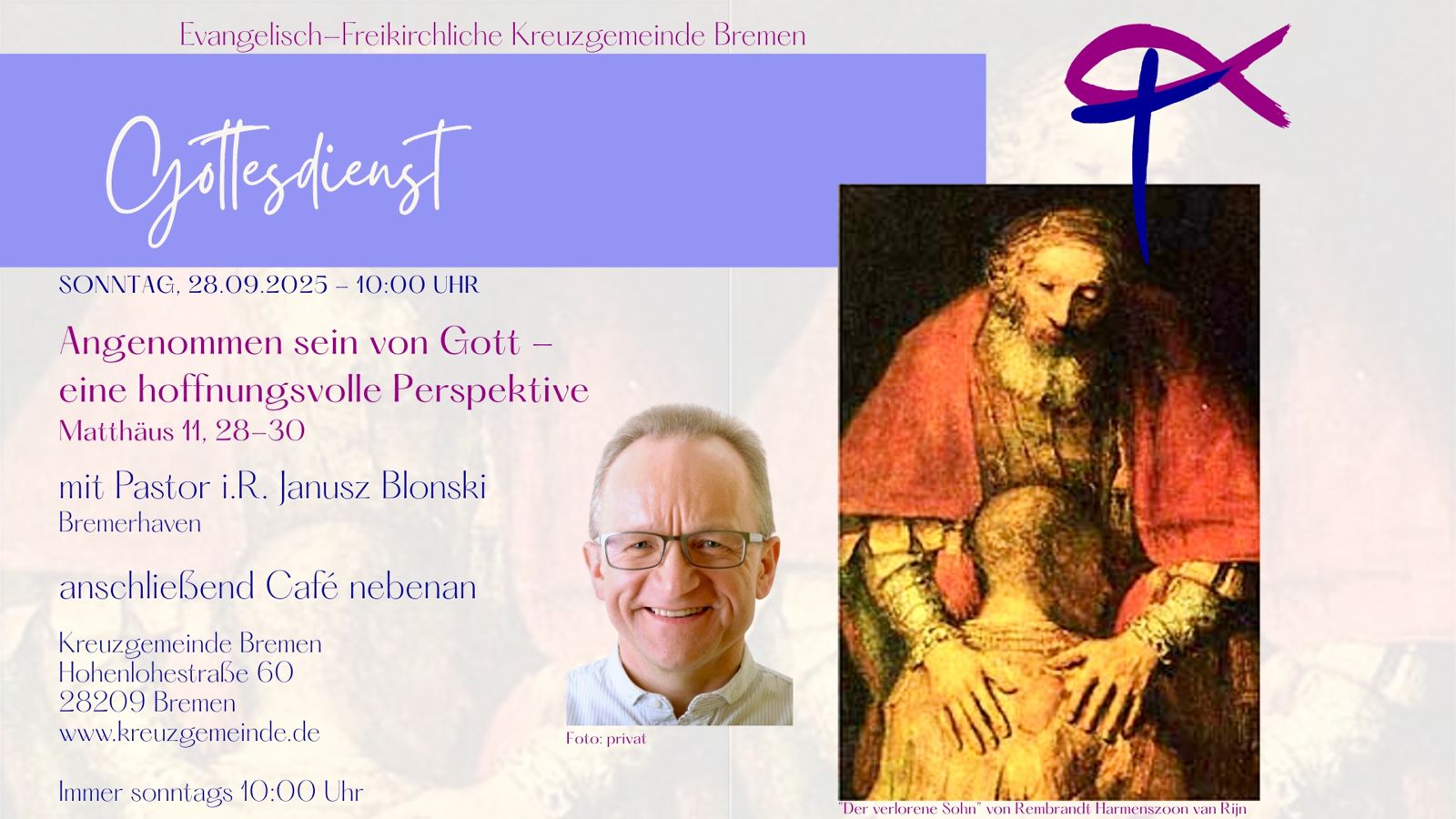Sonntag, den 28. September 2025 – 10 Uhr Angenommen sein von Gott – eine hoffnungsvolle Perspektive Matthäus 11, 28-30 mit Pastor i.R. Janusz Blonski Bremerhaven anschließend „Café nebenan“ Kreuzgemeinde Bremen Hohenlohe-Str. 60 28209 Bremen www.kreuzgemeinde.de https://www.youtube.com/watch?v=X1E5Wat521w