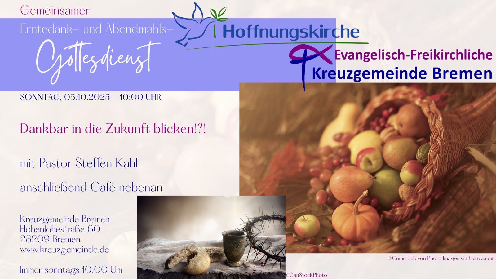 Sonntag, 05. Oktober 2025 – 10:00 Uhr Gemeinsamer Erntedank-Gottesdienst mit Abendmahl Thema: „Dankbar in die Zukunft blicken!?!“ mit Pastor Steffen Kahl anschließend Café nebenan Kreuzgemeinde Bremen zusammen mit der Hoffnungskirche Bremen Hohenlohestr. 60 28209 Bremen www.kreuzgemeinde.de https://www.youtube.com/watch?v=GZSymkKHj_Y