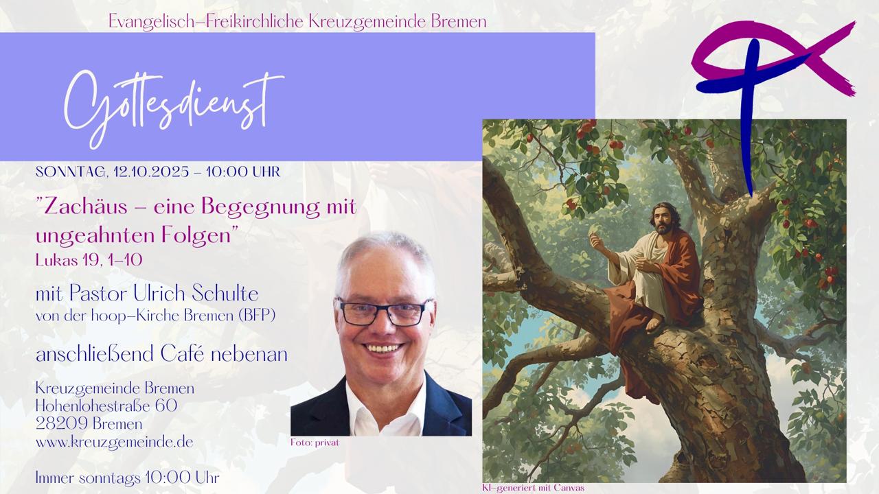 Sonntag, den 12. Oktober 2025 – 10 Uhr “Zachäus – eine Begegnung mit ungeahnten Folgen…” Lukas 19, 1-10 mit Pastor Ulrich Schulte von der hoop-Kirche Bremen (BFP) anschließend „Café nebenan“ Kreuzgemeinde Bremen Hohenlohe-Str. 60 28209 Bremen www.kreuzgemeinde.de https://www.youtube.com/watch?v=dm_HbhZ_26E