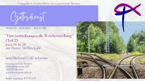 Sonntag, 19. Oktober 2025 – 10 Uhr “Eine verheißungsvolle Weichenstellung“ Josua 24, 14-28 mit Pastor Steffen Kahl anschließend Café nebenan Kreuzgemeinde Bremen Hohenlohestr. 60 28209 Bremen www.kreuzgemeinde.de https://www.youtube.com/watch?v=Ru4CGSU-eJM