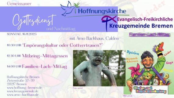 16. November 2025 – 10:30 Uhr – 12:30 Uhr – 14:00 Uhr Kreuzgemeinde und Hoffnungskirche gemeinsam in der Hoffnungskirche 10:30 Uhr „Empörungskultur oder Gottvertrauen?“ mit Arno Backhaus, Calden 12:30 Uhr: Mitbring-Mittagessen! 14 Uhr: „Familien-Lachmittag“ in der Hoffnungskirche Bremen https://www.hoffnung-bremen.de Zietenstr. 57 – 59 28217 Bremen https://www.youtube.com/watch?v=ug1Ry523c90
