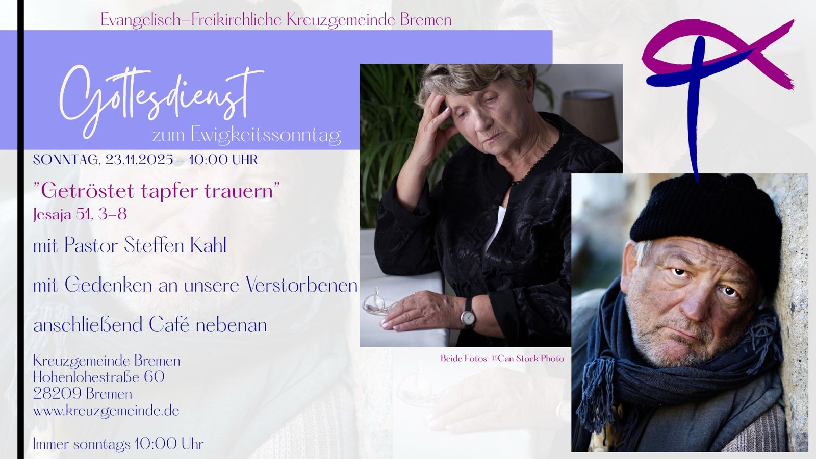 Sonntag, 23. November 2024 – 10:00 Uhr Gottesdienst zum Ewigkeits-Sonntag „Getröstet tapfer trauern“ Jesaja 51, 3-8 mit Pastor Steffen Kahl anschließend Gedenken an unsere Verstorbenen danach „Café nebenan“ Kreuzgemeinde Bremen Hohenlohestr. 60 28209 Bremen www.kreuzgemeinde.de https://www.youtube.com/watch?v=optOh7P8tEM