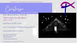 Selbstverständlich ist jeder in unseren regulären Veranstaltungen herzlich willkommen, egal welcher Herkunft oder Sprache. Aber oft ist gerade die Sprache ein Hindernis für Verstehen und tiefen Austausch. Dann kann es hilfreich sein, eine der internationalen Gemeinden oder Kreise in unserem Gemeindehaus zu besuchen: Neben der deutsch-sprachigen Gemeinde treffen sich bei uns im Gemeindezentrum der Kreuzgemeinde auch die „International Baptist Church of Bremen“ (IBC), die „Chinesische Christlichen Gemeinde Bremen“, die arabische Gemeinde und die spanisch-sprachige Gemeinde.